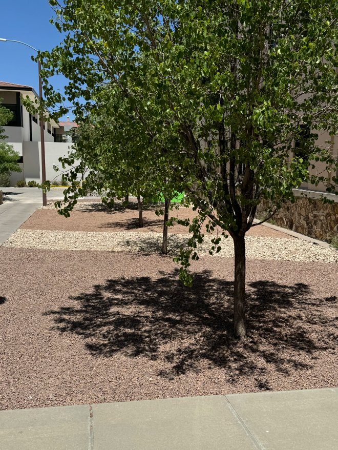 The gap between the Robledo and Doña Ana mountains funnels spring winds across the area. We plant windbreak rows of Desert Willow, Afghan Pine, or Italian Cypress on the windward side and use heavy gravel that stays put.