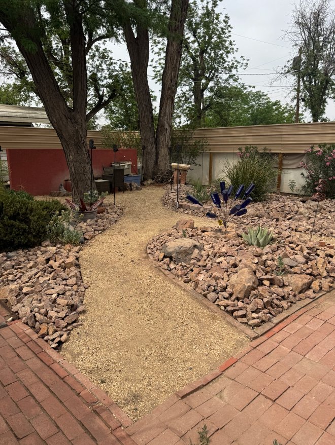 The flat mesa terrain has a hard caliche layer just below the surface. We trench and amend planting beds so roots can reach deeper, and we pick plants that handle alkaline, compacted soil.