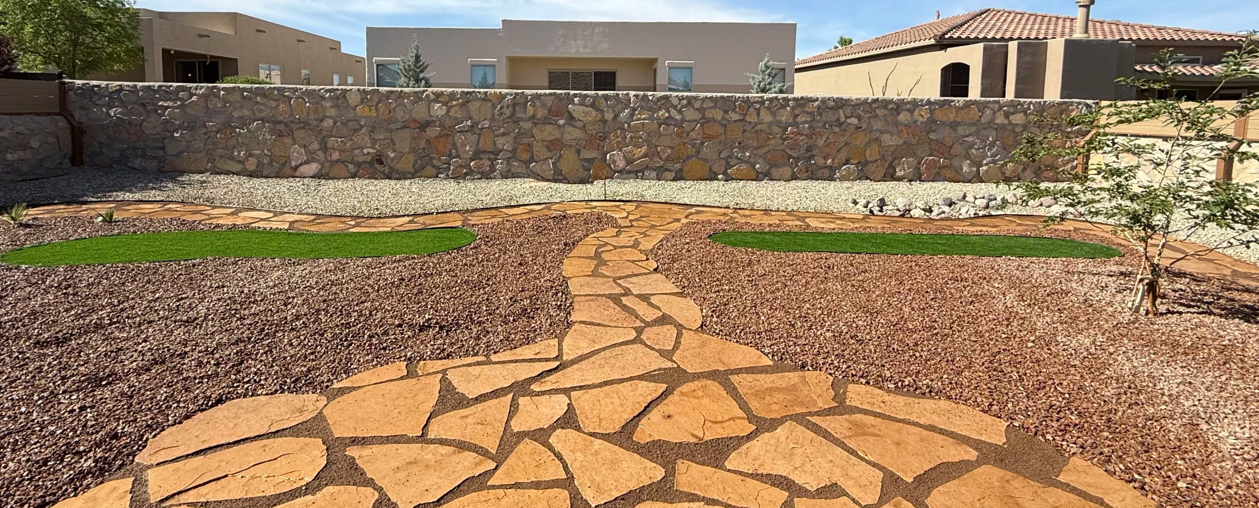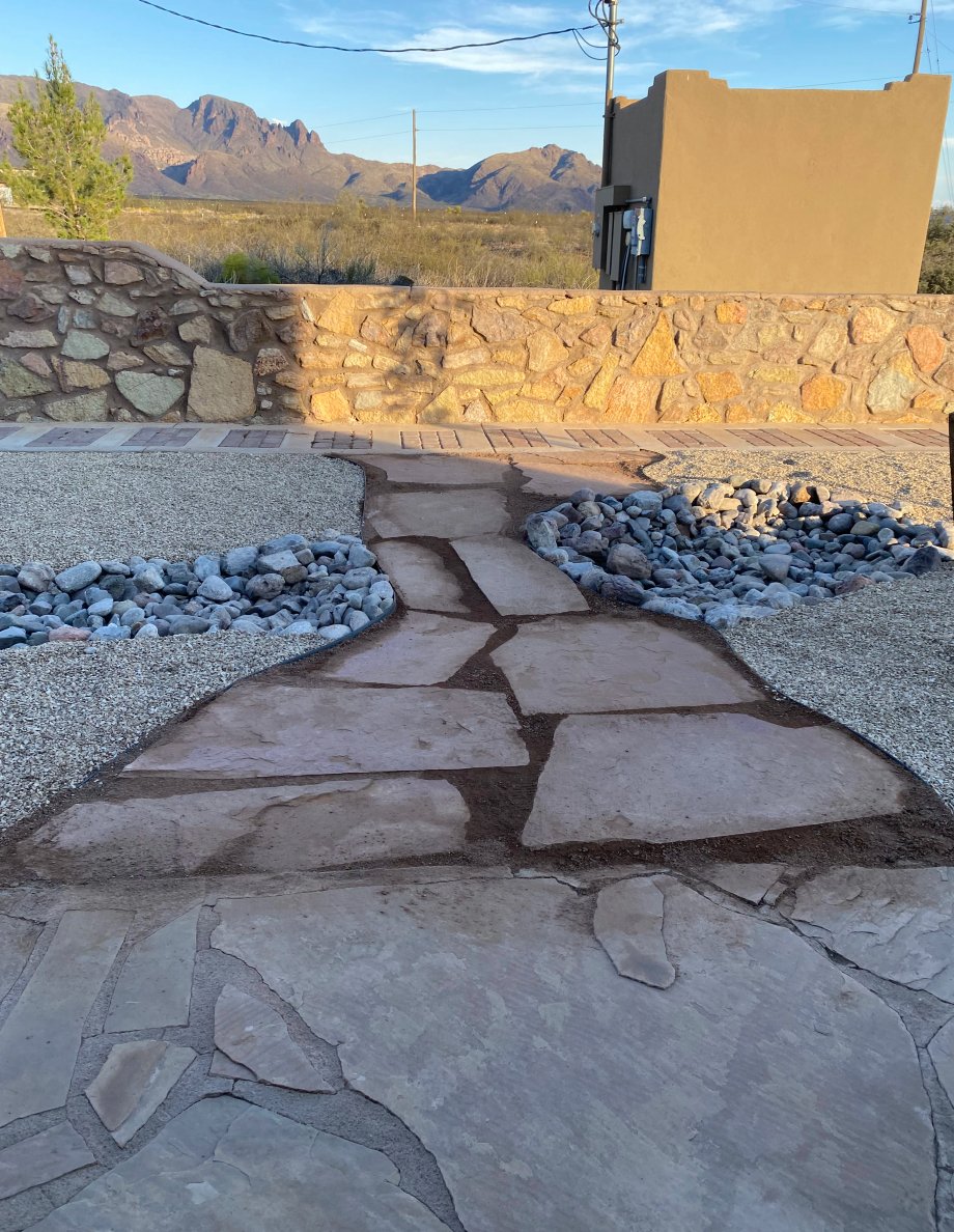 Flagstone patios: $22 to $32 per square foot installed. Natural-cleft sandstone, slate, or bluestone. Sand-set with stabilized joints for a softer look, or mortared on a concrete base for a permanent install. The most custom option, no two installs alike, pairs naturally with desert plant palettes.