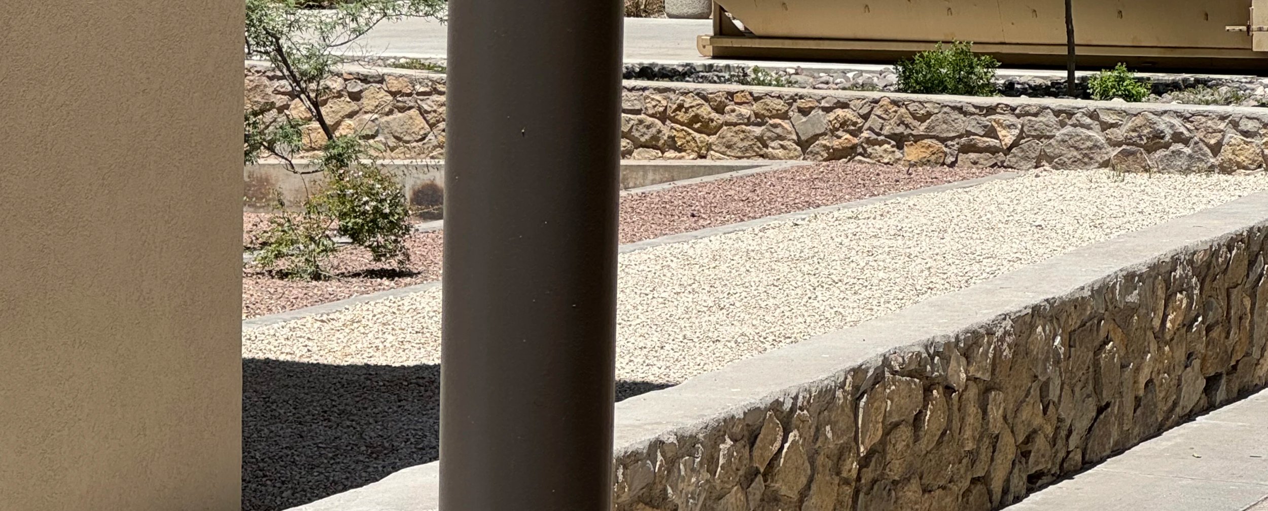Local sandstone: the workhorse. Warm tan and red tones that match desert palettes, easy to source from regional quarries, holds up to UV and freeze-thaw cycles. Best for dry-stack borders 6 to 12 inches tall.