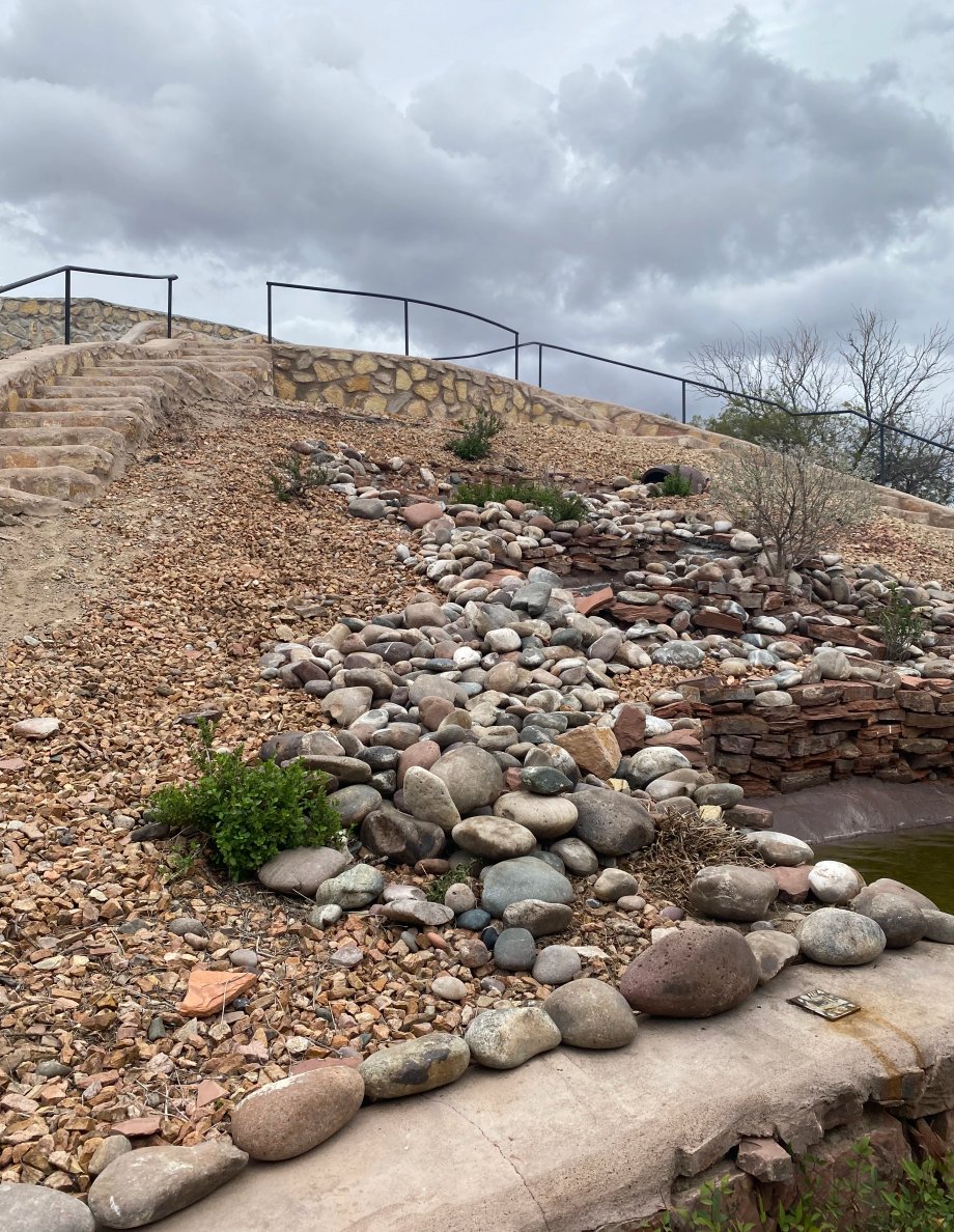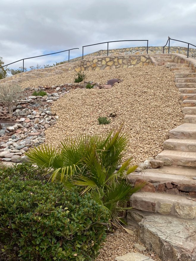 Granite cobblestone: cut granite cubes, denser and more permanent than river cobble. More expensive, reads as imported, best for formal garden edging and historic-look properties in Mesilla.